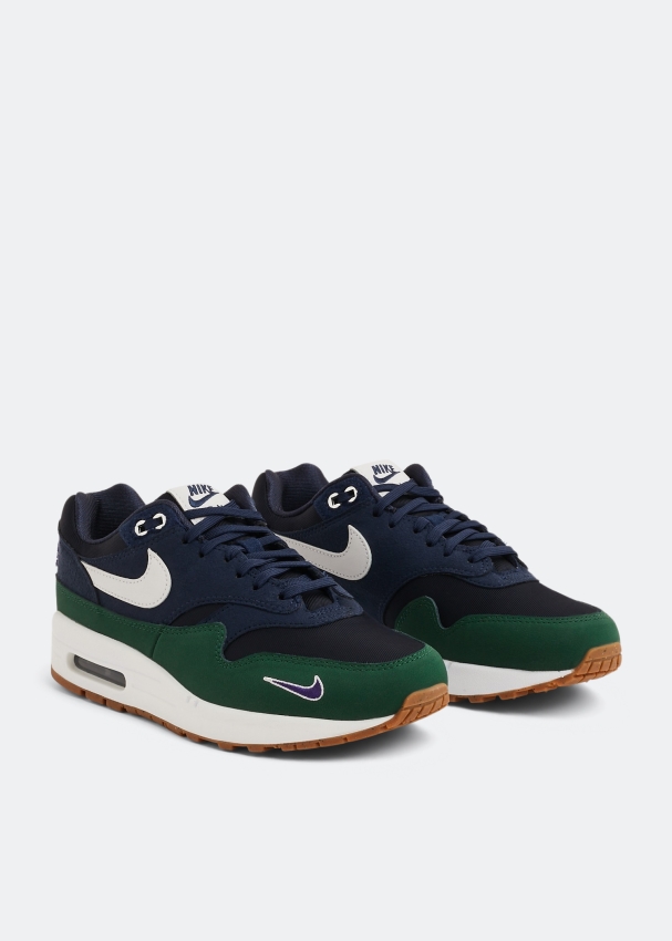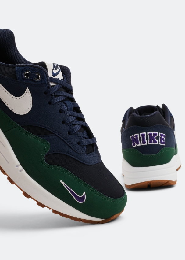 Presented in varsity hues in suede and nylon, these Air Max 1 'Gorge Green' sneakers by Nike are detailed with embroidered accents. The Gum outsole, tried-and-tested cushioning and classic wavy mudguard complete the iconic vintage-inspired style.
