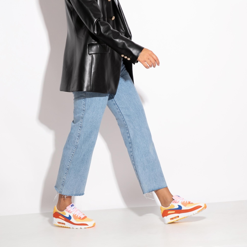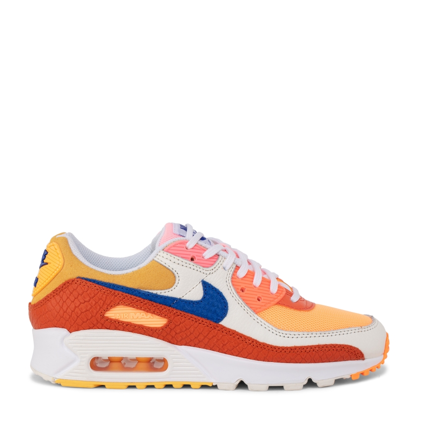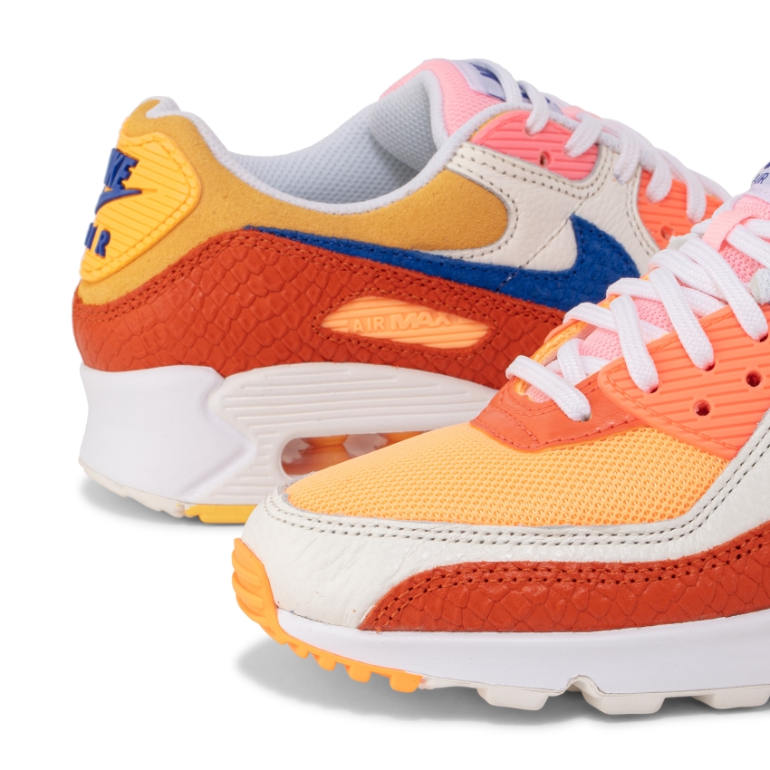 Update your sneaker collection with Nike's new Air Max 90 "Campfire Orange" sneakers. Designed with vibrant snakeskin panels, they offer a burst of colour and a luxurious edge to streetwear edits. They feature a mesh toe, a suede collar, tumbled leather details, profile Swooshes, an Air-Sole unit and lace-up closure.