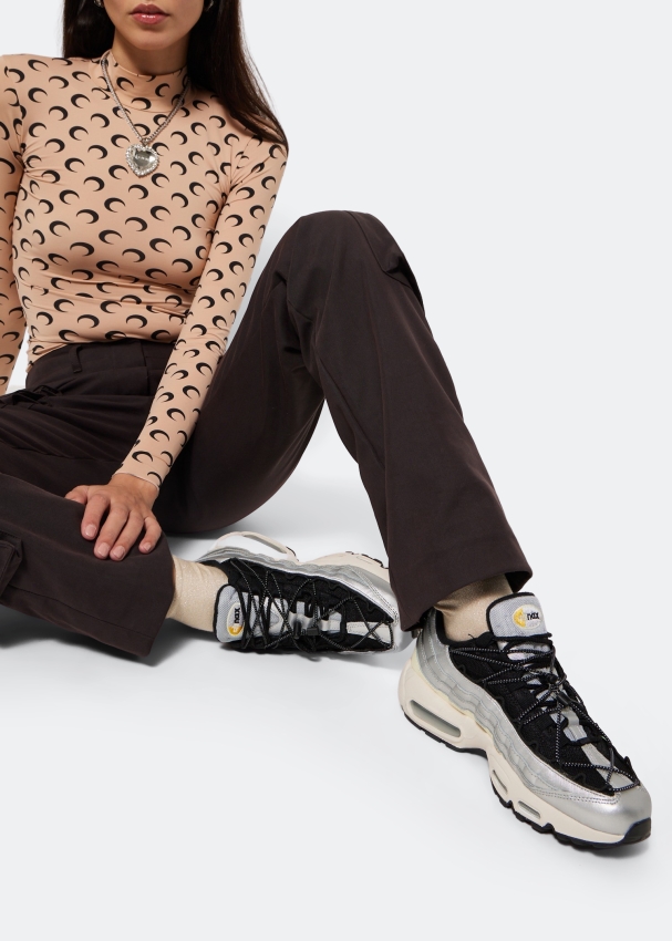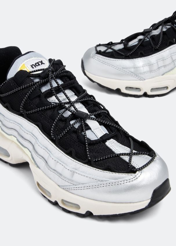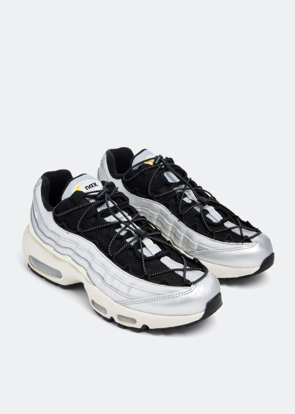 This season's version of the Nike Air Max 95 sneakers arrives in a 'Metallic Silver, Alabaster, and Black' colourway. The leather and mesh upper features 3M reflective detailing and a toggle lacing system atop a two-tone rubber sole.
